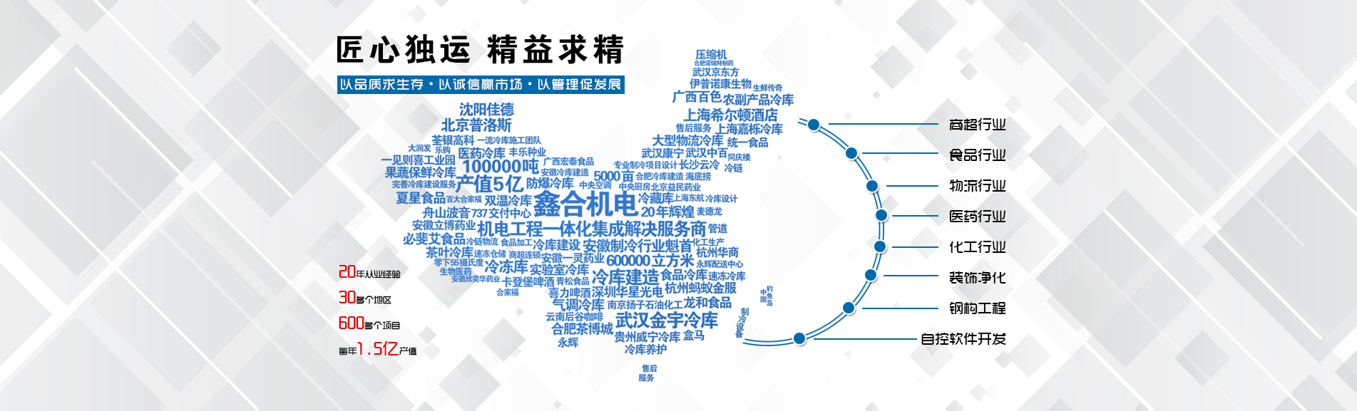 冷凍冷藏設備大型冷庫項目: 武漢中百物流冷庫(40000㎡)、蘇州、北京普洛斯大型物流庫(17000㎡)、沈陽佳德物流冷庫(20000㎡)、上海東航配餐物流庫(6000㎡)、杭州華商勾莊物流冷庫(24000㎡)、安徽安心蔬菜綠色食品冷庫(12000㎡)、武漢金宇冷庫(35000㎡)、必斐艾食品廠(14000㎡)、中國-東盟(百色)農產品交易中心冷庫物流工程(30000㎡)、遵鐵物流冷鏈物流區建設項目中心冷庫物流工程(16500㎡)、長沙云冷產業園冷庫物流工程(21000㎡)等;大型中央空調項目: 武漢康寧顯示玻璃廠廠房、武漢京東方模組廠房、武漢華星光電模組廠房、深圳華星光電模組廠房,杭州阿里巴巴辦公樓,舟山波音737機場辦公樓,南京江北能源站、上海金融大酒店等